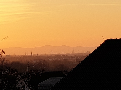 A sunset, looking from east to west, showing the left Rhine side hills, with several towns in between, power pylons, industrial areas (only the largest chemical factory in the world), agricultural fields, a major city (Mannheim and Ludwigshafen on the other side of Germany’s largest river, the Rhine).