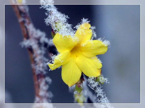 I took a photo of a flower winter jasmine with the delicate frost flakes on them and at the back of my mind I remembered …