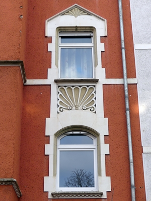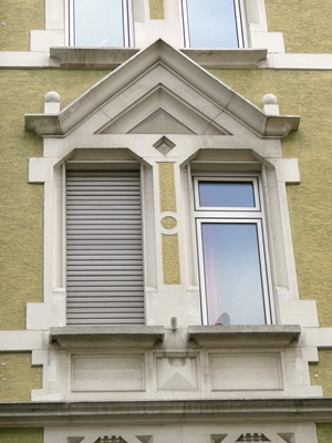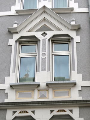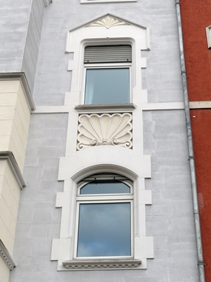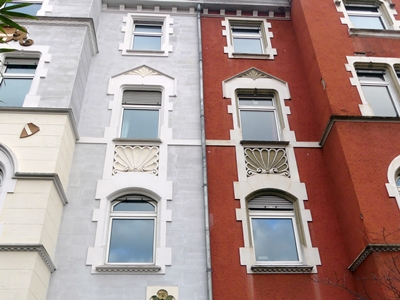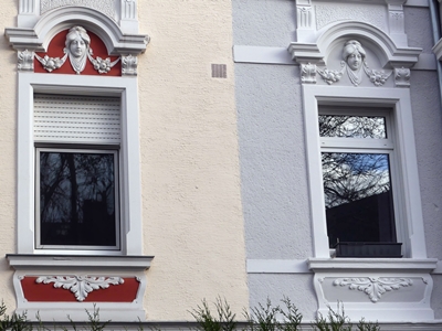 Many of the houses in the Martinsviertel in Darmstadt are more storey buildings from around the turn of the century (19th to 20th century, not the millenium). They were not free standing houses but terraced houses, originally with uniform looks. But more than 100 years later they have different owners and the front of the houses look differently by keeping the main features.