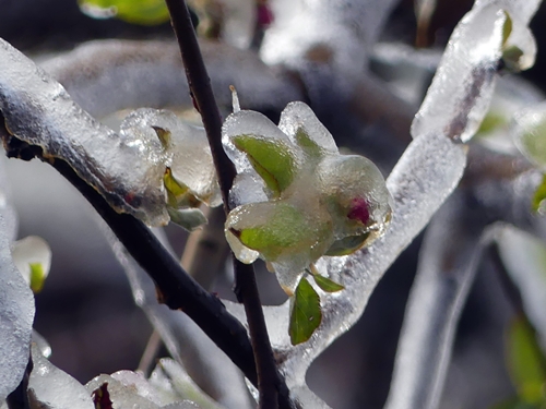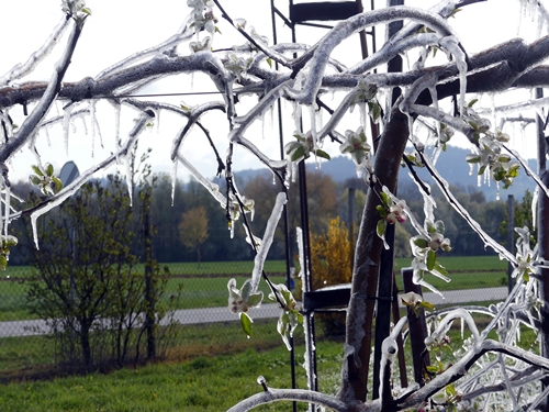This is an espalier fruit (apple trees) field. The plants, the blooms are covered in ice. On the ground lies frost. But it ends abruptly at the fence and the flowering bushes around are frost free.