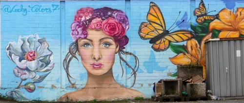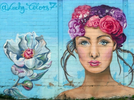 However, this doesn’t suit every subject. Take his oblong (flowery) mural. Here it is in the original format (slightly cropped) including the dirty white paneling on top and the tar below, one side kept intact because of the sprayer’s signature and the compromise on the right side, with part of the garbage and the shed but losing a flower.