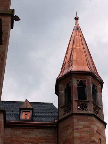 No, I’m not dyslexic and I didn’t want to talk about snakes. This is one of the spires of the Kaiserslautern church St. Nikolaus wearing a copper hat.