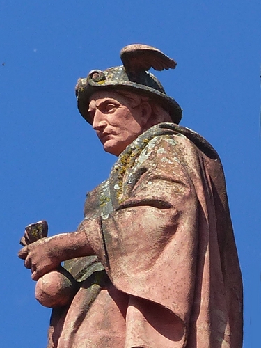 The helmet gives it away, this here is either Hermes or Mercurius, the Greek or Roman god of merchants and thieves who was often employed by the other gods as messenger because of his speed as symbolized by the wings. He stands high up on the walls of Castle Biebrich in Wiesbaden and I wonder why they chose to depict him so … mature rather than the young spritely god.