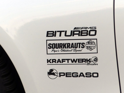 I saw this on an already very expensive model of a Mercedes Benz yesterday. Two of the company labels are motortuning and chiptuning respectively for the car itself. Sourkrauts (love that name) is a clothing label geared for car enthusiasts. And Pegasus used to be a Spanish car manufacturer.