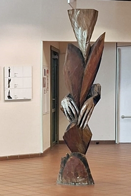 When I take photos on my phone (incidentally, this one is called Gladys) I need to attach it with a cable to the pc to store it without loss of quality. I store all my photos on the computer and I edit only on the computer. But occasionally I’m in a hurry then I send a photo to myself in a messenger programme which I can access by phone and by computer, and then I upload it and store it. It’s cumbersome and a pain but for me it works. This particular photo is of a piece of art standing in a hospital lobby which I took this morning.