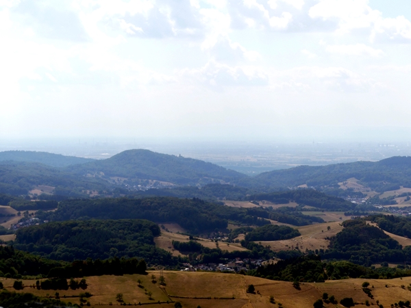 This is the view from the Tromm, one of the highest mountains / hills in the Odenwald towards the west. The Wachenburg, a fortress I normally look up to, can be seen in the middle and beyond is the Rhine Valley. On a clear day one can see the hills of the Palatinate in the distance on the other side of the river.