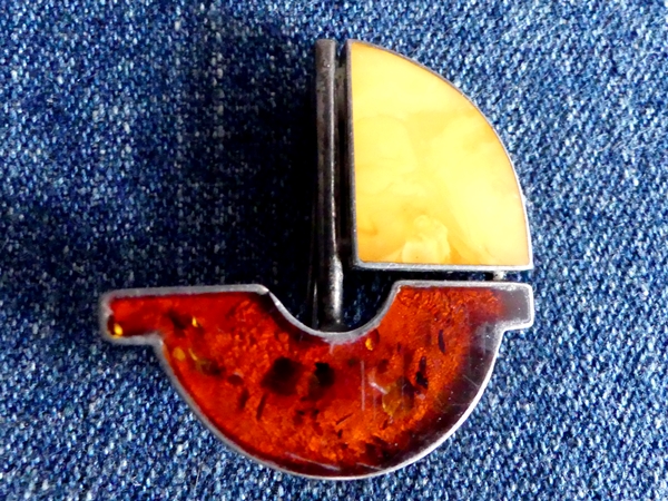 Cogs are medieval ships mostly associated with the Hanseatic League in north-western Europe. Amber is found predominantly in the areas surrounding the western Baltic Sea. In Stralsund and Greifswald there are many jewellery shops exclusively dedicated to amber. This brooch shows off the two extremes on the amber colour scale.