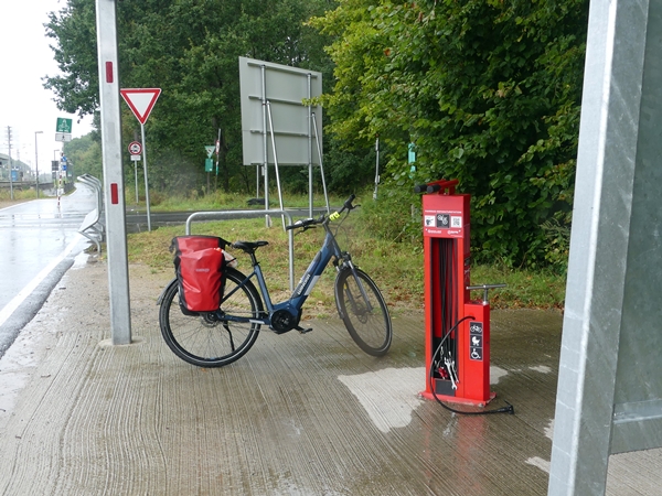 And this is the new bike autobahn between Frankfurt and Darmstadt (only completed in stages yet). Every 5 or so kilometres there is a bike station which provides shelter from the rain, air for flat tires and tools to do minor repairs. And the path itself is a wide lane exclusive for bicycles to entice more commuters to leave their cars at home. Wynora Rider, my trusted steed, approves wholeheartedly – and wishes there would be more such bike ways soon.
