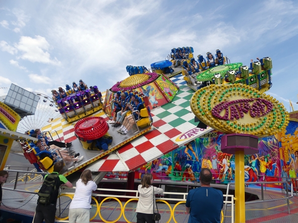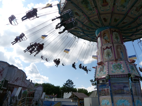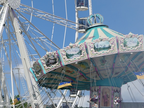 The fairground came to Michelstadt in the Odenwald. The event is known as the “bees’ market” and it ends with a bee exhibition and the auctioning off bee colonies and beekeeper paraphernalia.- The fairground attractions are usually garish in colour, bright and shiny but this rather old-fashioned swing-carousel is doing it in pastels.