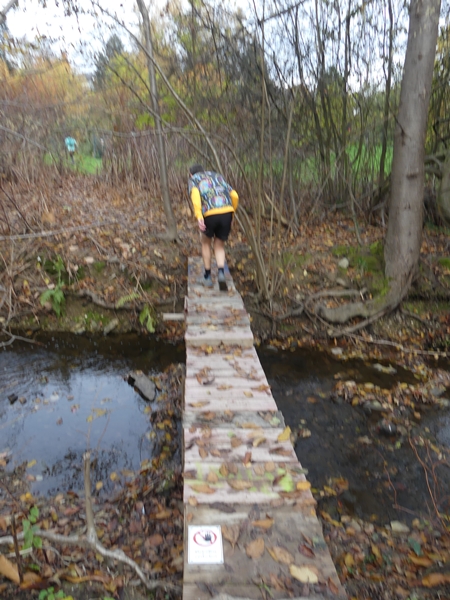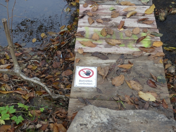 Walking happily along, following our marked trail, we came upon this little brook. There was a small bridge with a sticker “Keep off!” on it.