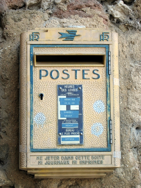 A few weeks back Jude showed rare red postboxes she found in the UK. I added a couple of old blue ones from Germany. Going through older files I came across this French postbox. The colour, even today, of French letter boxes is yellow. This particular one, found in Oppède in Provence, is not ancient but old enough.