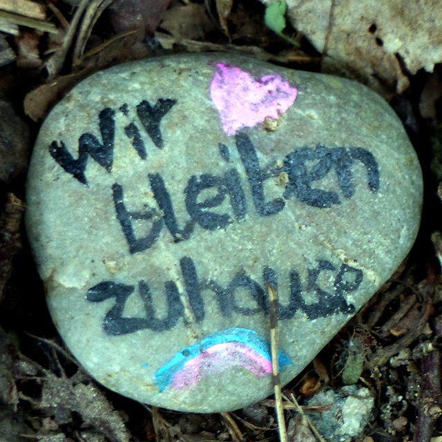 A painted pebble carrying a message of solidarity. Who knew even a year ago that staying home would be a sign of caring today?