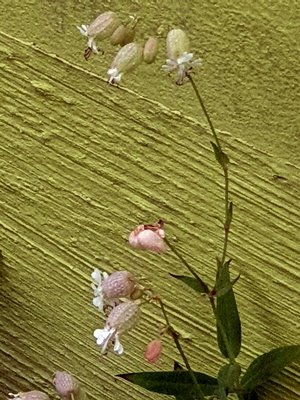 I saw this flower growing between the pavement and a wall (which was really a darker shade of off-white, not quite beige) and took a photo with my phone because I thought it looked interesting in a delicate kind of way. The colours surprised me. Even after cleaning the photo up the strange colour remained. I have no idea why but the little flowers were quite cute.