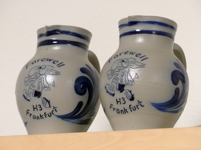 Traditionally, the local cider is served from these jugs. They are called “Bembel” and are typical for the area around Frankfurt in Germany. They are grey with a blue glaze but more importantly if you drink a lot of the Äppler, as the cider is called, you end up “glazed” or in the local vernacular: “blue”.
