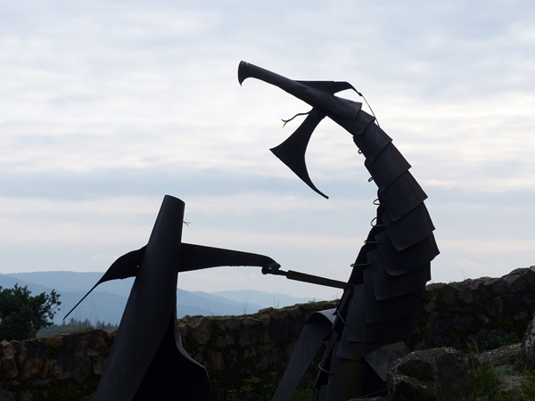 The Nibelungensteig is a walking track cutting through the Odenwald for 130 km following the legend of the Nibelungen. In 15 places there are sculptures by Jens Nettlich depicting parts of the story. This is near the castle ruin of Lindenfels – almost the beginning of the story. Siegfried, the blonde hero, has forged his sword Balmung and kills the dragon Fafnir with it.