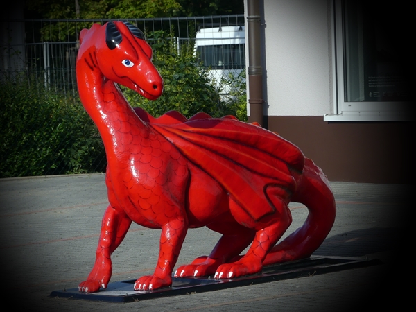 The Nibelungensteig is a walking track cutting through the Odenwald for 130 km following the legend of the Nibelungen. In 15 places there are sculptures by Jens Nettlich depicting parts of the story. This is near the castle ruin of Lindenfels – almost the beginning of the story. Siegfried, the blonde hero, has forged his sword Balmung and kills the dragon Fafnir with it.
