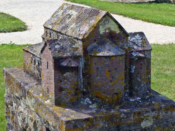 There are not many buildings left from the Carolingian area in Germany. The most famous is the Lorsch Abbey near Worms in the Rhine Valley, a UNESCO world heritage site. The basilica of Einhard, about 40km to the east, is less well-known. This is a model on the site.