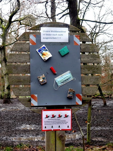 In Germany many people don’t throw their used clothes in the normal garbage but in old clothes (and shoes) containers. Lately, these have been criticised because many companies either just shred the clothes (many of them are still wearable) or they are sent to poor areas in Africa where they are resold and are crippling the local textile industry. This particular company has made a point to explain what they do with the collected clothes: they sort the donated clothes, 70% of which are worn (they don’t say by whom or where), the rest is recycled to make new clothes. They added an interesting fact: to produce a new t-shirt up to 20.000 litre of waters are needed. Recycling is good for the environment, they state. I find it ironic that a plastic bag full of refuse has been dumped right next to the sign.