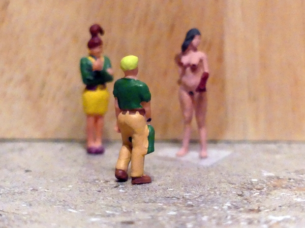 Aleksandr, Sergei, and Yakov at the nudist beach when Maiya walks past.