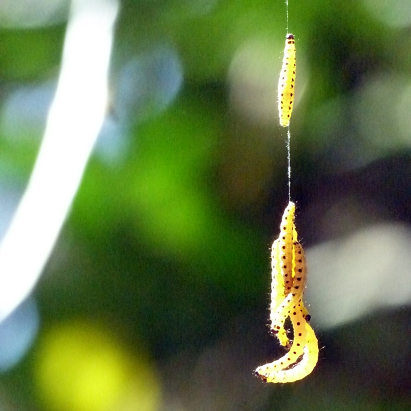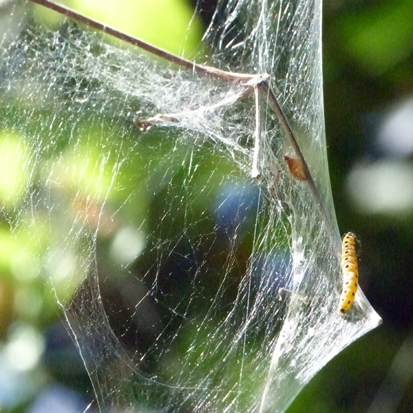 These nests or webs look delicate, yet the threads are surprisingly strong and non-sticky. These are ermine moths, so called because they are white and have black dots. The caterpillars eat all the leaves of a tree or bush, then completely cover it with these webs, and in about a fortnight they will have turned into moths (and the tree or shrub, incidentally, will grow new leaves).