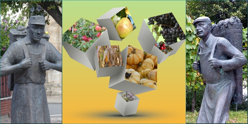The farmer with the sickle and the sheaf of spikes of wheat is one of four figures at the bottom of the fountain on the market place in Bensheim. St George, the patron saint of the town, and his dragon form the centre piece on top of a column.