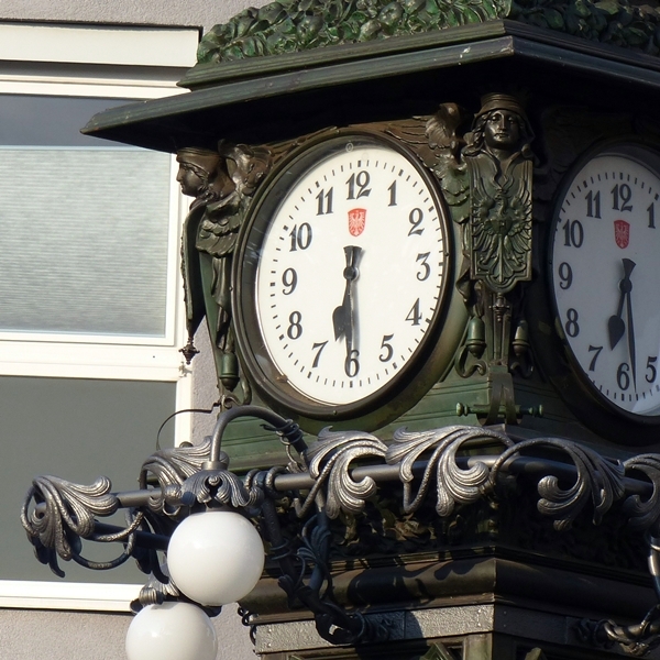 I suppose I could have gone out and caught a clock at exactly 7 o’clock but it was much more fun to look at all the clocks in my archive. The closest I came to 7 o’clock was half past six (or “half seven”) on the face of the Uhrtürmlein in Frankfurt