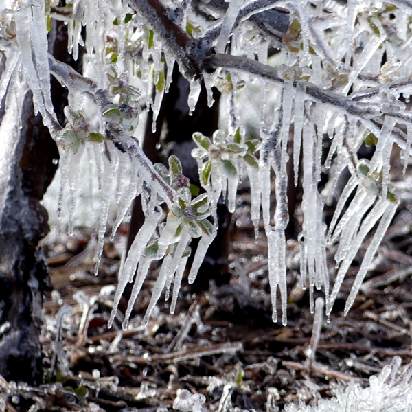 It hasn’t been cold enough yet this year so I had to go back about 18 month when the fruit trees had already started to flower and a cold snap was on the way. The way to protect the blooms is to put on the sprinklers and make the forming ice protect the leaves and shoots.