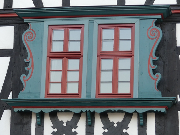 with windows in half-timbered houses. These are all from Lindenfels, a small town in the Odenwald. If you look closely you will see the dragons sitting in front of the middle one.