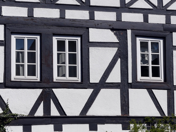 A traditional half-timbered house with dark wood, white wash and white framed, rectangular windows with small panels