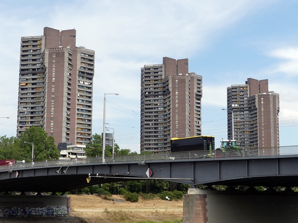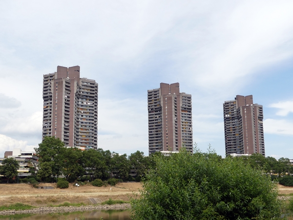 NUB stands for Neckaruferbebauung Nord. It consists of three highrise residential building with terraced buildings in front and several school buildings, on the northern banks of the river Neckar in Mannheim.