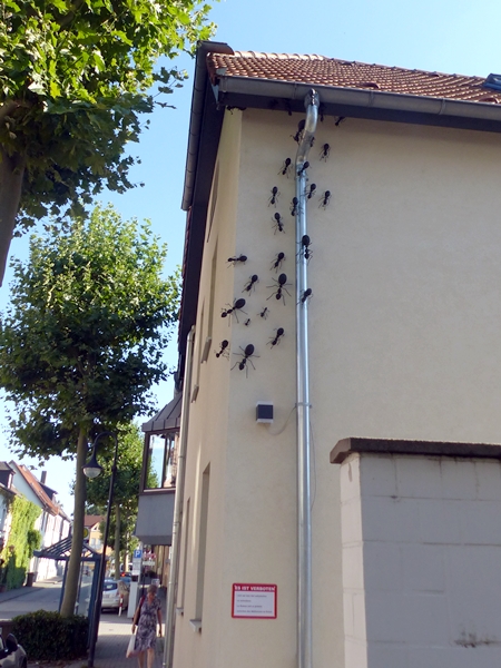 That’s a house in the town centre of Bad Tölz. Like most houses here it is beautifully maintained. It has a cute little dormer, the windows are set-off by paintings and it has painted and raised stone panels running up the facade. Looking up reveals a painted, maybe even tiled border in the overhang of the roof. The difficulty in photographing a house like this is caused by the narrow streets which makes it difficult to get a shot of of the whole house. Furthermore, being in a group and not being able to really set up a shot results in cut off corners and weird angles. But here it is.
