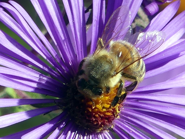 Emphasis on the waves of lilac asters or emphasis on the single bloom with a busy visitor.