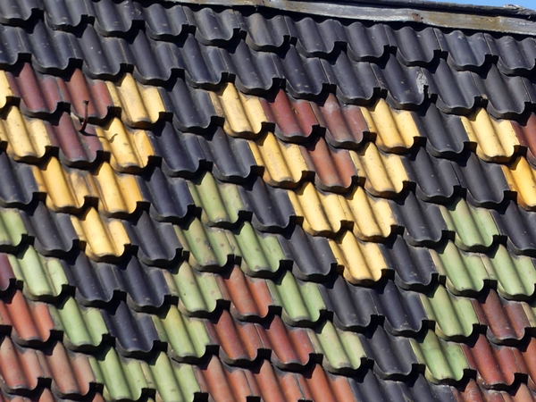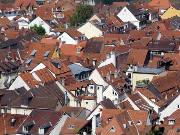A single colourful roof in Heidelberg on the northern side of the river Neckar and the roofs of the old part of Heidelberg town as seen from the castle above.