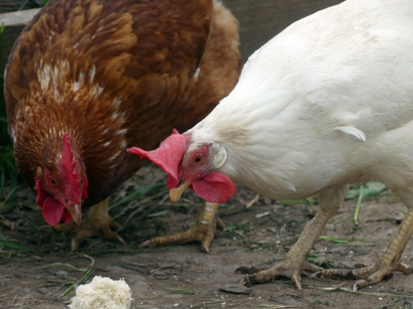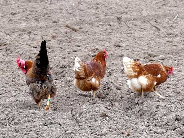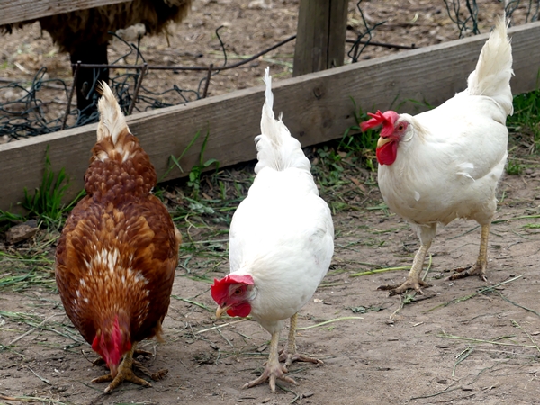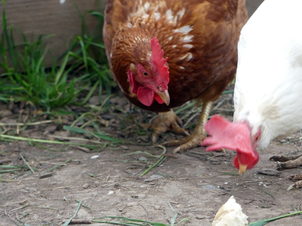 Proudly crowing and modestly clucking.