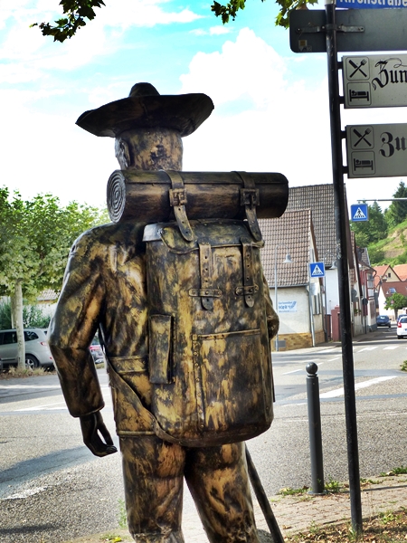 But although a pilgrim has no choice in the destination of his route he is for all other intents and purposes a traveller although not a tourist. His journey is his reward and he carries all his needs on his back. This particular wanderer stands in Laudenbach, between the Odenwald and Rhine Valley, from where he would turn towards the South East towards his final destination.