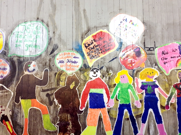 This colourful mural, or rather a few parts of a mural in an underpass in Frankfurt, was created by children. The writing suggests that at least some of them are not native German speakers, yet their take on children’s rights is powerful: