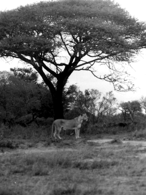 We were driving on the roads of the Kruger Park, somewhere between Skukuza and the Lower Sabie Rest Camp, when we saw a large yellow animal standing under the tree in the distance. Only when we got nearer we were realising that it was a lioness.