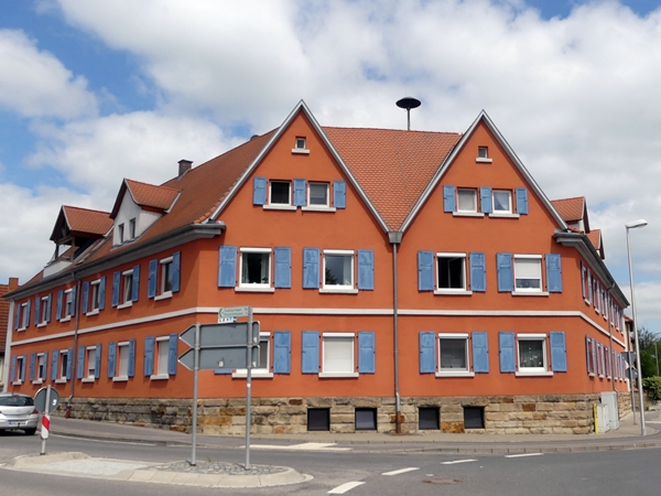 A single colourful roof in Heidelberg on the northern side of the river Neckar and the roofs of the old part of Heidelberg town as seen from the castle above.