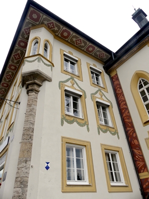 That’s a house in the town centre of Bad Tölz. Like most houses here it is beautifully maintained. It has a cute little dormer, the windows are set-off by paintings and it has painted and raised stone panels running up the facade. Looking up reveals a painted, maybe even tiled border in the overhang of the roof. The difficulty in photographing a house like this is caused by the narrow streets which makes it difficult to get a shot of of the whole house. Furthermore, being in a group and not being able to really set up a shot results in cut off corners and weird angles. But here it is.
