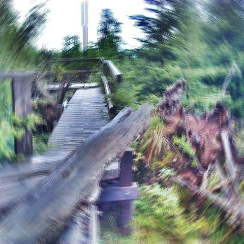 The walkway leading over the small bushes and trees starting to reclaim the soil.