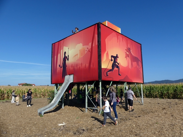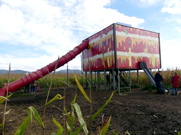In the middle is a tower structure where one is able to get an overview of the maze: