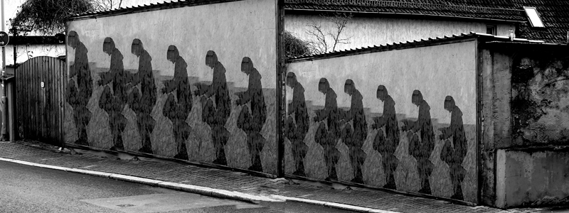 Christmas lights crossing the street. Different celebration, same application. Narrow spaces between houses in the old part of town. Monochrome Madness: The space between
