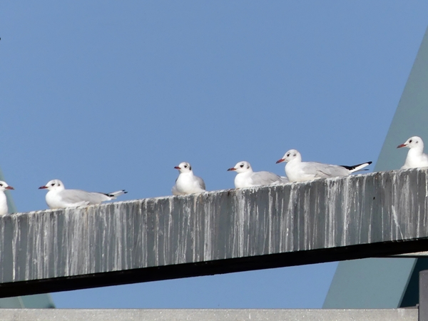 Three sparrows on parade waiting for a hug? A trio – two ring-necked paraketts and a pigeon – showing me their backside. And to round it off a trio of three different species: a duck, a moorhen, and a small gull. Thursday Trios