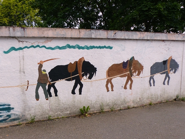 These murals in Lindenfels are badly faded, I enhanced them with photo shop. The left picture depicts the traditional costume of Lindenfels in the Odenwald; the right picture shows young women from Moëlan sur Mer in traditional Breton costume. The two towns are twinned.