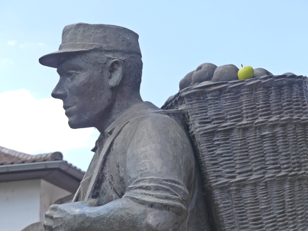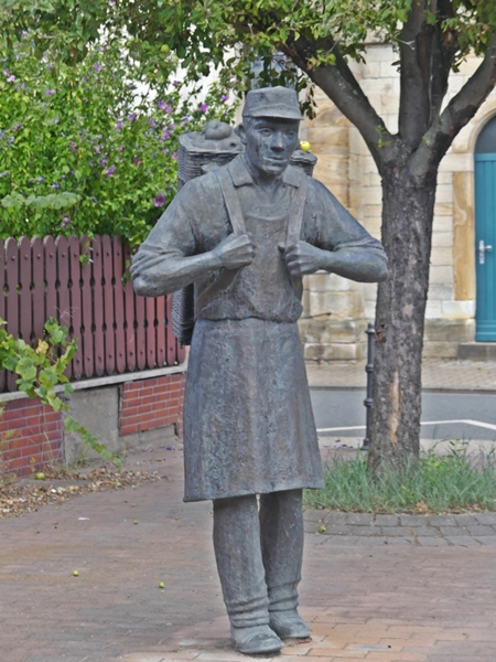 This statue of an apple picker stands in front of the old town hall of Trebur, a town near the River Rhine in Hesse.