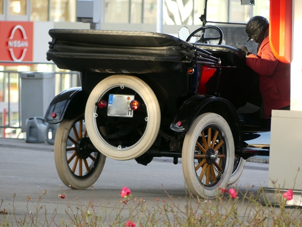 I’m used to seeing vintage cars, particularly really old ones like this one, at museums or possibly car shows, so I was startled when I saw this one nonchalantly pulling up at a petrol station and being filled up with normal petrol or possibly diesel. BTW: The H, the last letter on the car license plate, stands for “historic” and is reserved for vintage cars (provided they are maintained more or less like the original ) and it has advantages regarding insurance and tax purposes and I also think exemptions regarding emissions.