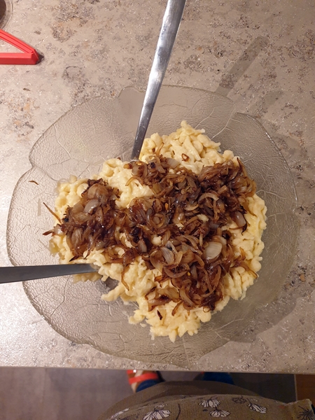 Not a work of art and I feel it also does need an explanation. Our son had forgotten to let me know that he wouldn’t be home for dinner. Since I had made one of his favourite dishes (Kässpätzle) I thought I had to show him what he was missing.