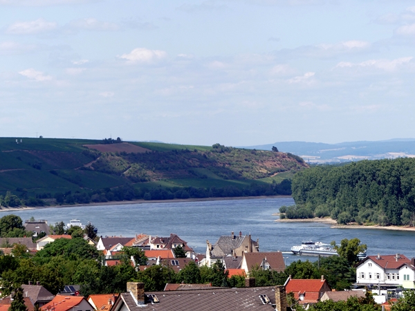 The Middle Rhine is a narrow valley with towns and villages at the banks of the river and steep hills on both sides, roads on either side and train tracks too.