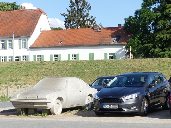 Turns out it is a sculpture in Rüsselsheim, the headquarter of the Opel corporation (long since swallowed by GM), a tribute to the Opel Manta, the iconic 1970s car in Germany.