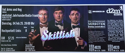 We purchased these tickets almost two years ago. My husband and I really enjoy the skits of Foil Arms and Hogg so very soon after having seen them in Frankfurt in late 2024 I purchased the tickets for February 2025 for their new show. I commented that I hoped that we still remembered the date almost 12 months later as we were not getting any younger. January this year came and anticipation grew. Less than a week before the show was cancelled and we received the option of either getting our money back or getting tickets to their next show in Frankfurt. We opted for the next show. It’s planned for late February 2026.